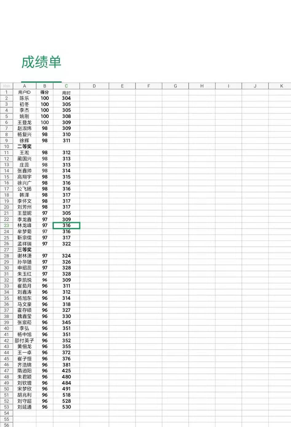 活动开始前,工作人员从题库中选取50道题作为考试内容,并将答题的二维码在QQ群中公布,各参赛成员准时扫描二维码进行答题,后台人员及时观测后台的答题情况,各参赛人员都在规定时间内完成了答题,系统按成绩将获奖人员筛选出来,之后工作人员将获奖名单下发至QQ群里。
