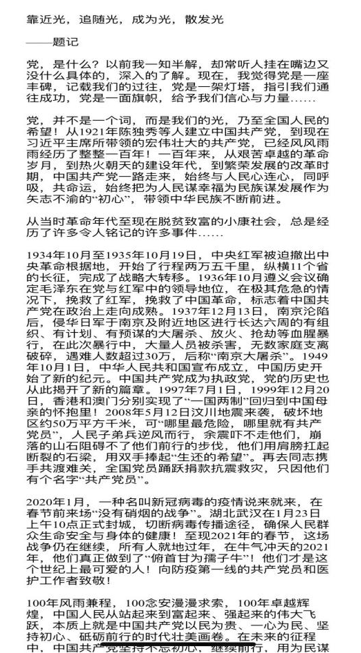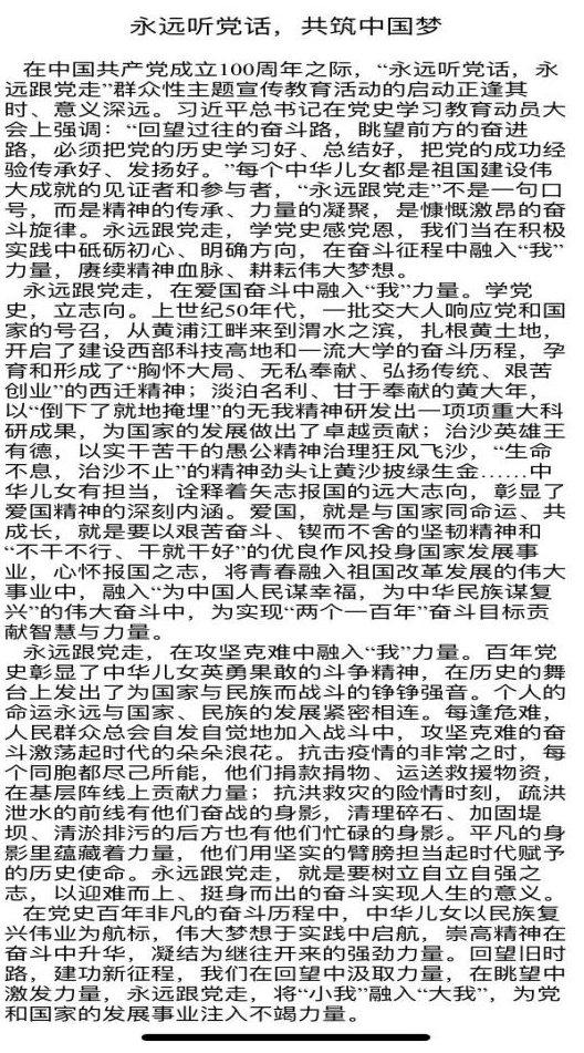 本次活动通过网络平台举行,参加活动的同学们以文字的形式将党带领人民伟大奋斗历程和取得辉煌成就的所感所想记录下来,用最朴实的语言写出了自己心中最美好的的中国梦。在写作的文章中同学们纷纷表示要从自身做起,规划好自己以后的学习生活,努力为建设社会主义现代化强国而奋斗!