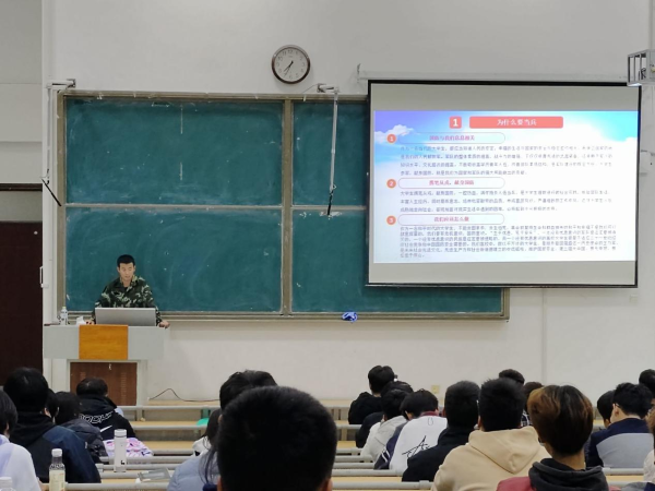 宣传会开始后,首先由高亮通过PPT、视频等方式向大家讲述了军旅生活的点点滴滴。他向大家介绍了中国人民解放军和野战军的历史,分享了在部队生活中信任背摔、负重拉练、战场救护、野战生存等刻苦训练的经历,还讲述了在部队期间他参与抗洪抢险的光荣事迹。他认为党和国家为我们创造了今天的幸福生活,我们就要用自己的力量为祖国明天的发展和安全作出努力,积极参军,保家卫国。