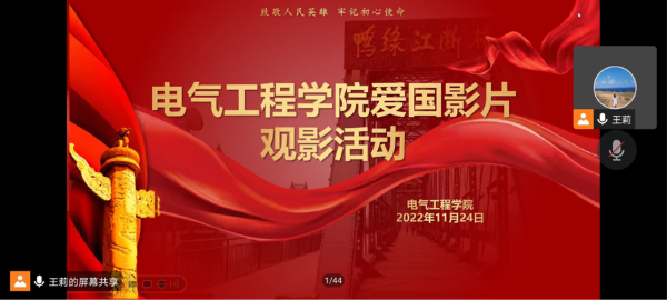 为了让同学们更加深入认识了解祖国,激发同学们的爱国情怀,让同学们把爱国意识根植于心,更好发扬和传承红色精神。2022年11月24日晚8点,电气工程公司举办了爱国影片观影活动,此次活动由公司辅导员王莉主持,22电气本4、22机器人本、22人工智能本班级的全体员工参与观影。因受疫情影响,观影活动改为线上进行。
