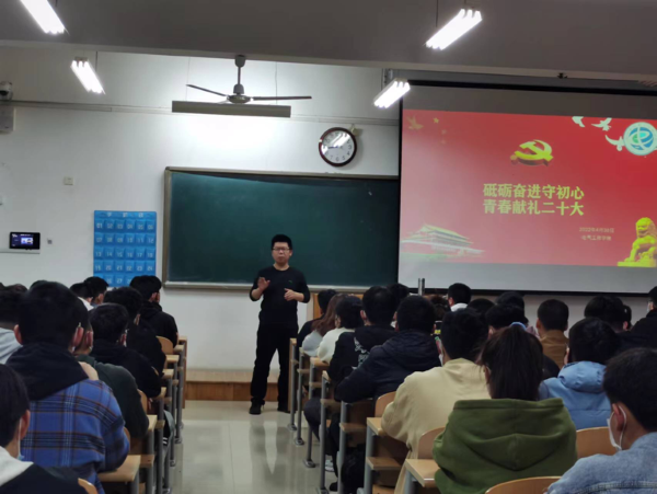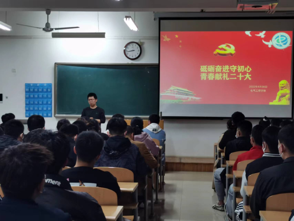 为深刻领会党的二十大的重大意义、丰富内涵,让青年群体能够了解和读懂党的二十大,2022年4月30日,电气工程公司团总支在八号教学楼401教室开展党的二十大进校园宣讲活动。本次宣讲会由电气工程公司员工科科长赵建斌主讲,电气工程公司共青团员参与集中学习。