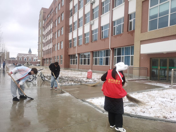 同学们在老师的带领下,按照要求来到分配好的区域,拿着铁锹、扫帚等工具从道路两端开始积雪清理工作。清扫工具在志愿者的手里不停的飞舞,散播着志愿者的爱心。大家干劲十足,经过一个小时的奋战,积雪终于被清理干净,11号教学楼周围的道路恢复了畅通洁净。在凛冽的寒风中,大家以自己的实际行动,消除了安全隐患,给师生带来安全和便利。